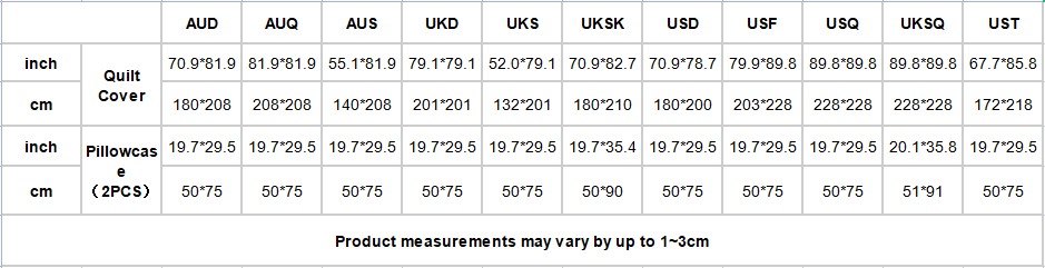inch | Pillowcase(2PCS) | 19.7*29.5 | 19.7*29.5 | 19.7*29.5 | 19.7*29.5 | 19.7*29.5 | 19.7*35.4 | 19.7*29.5 | 19.7*29.5 | 19.7*29.5 | 20.1*35.8 | 19.7*29.5 |